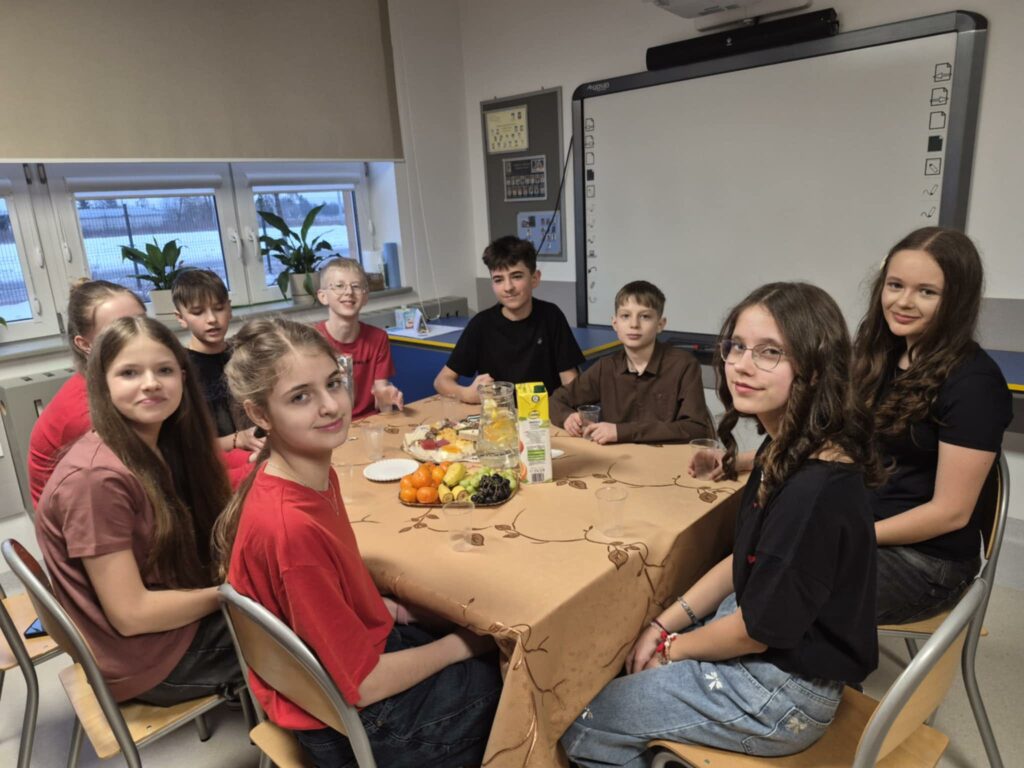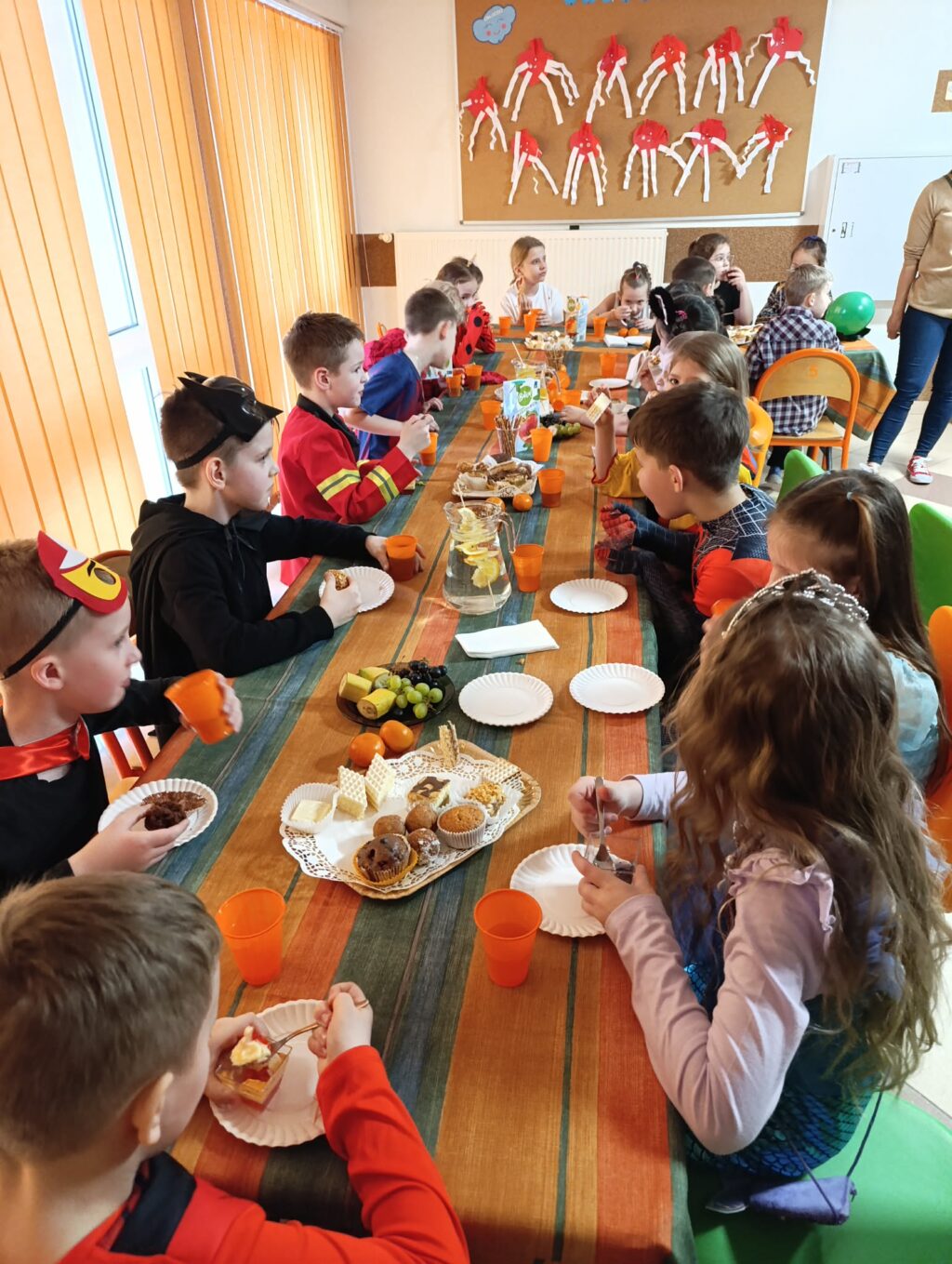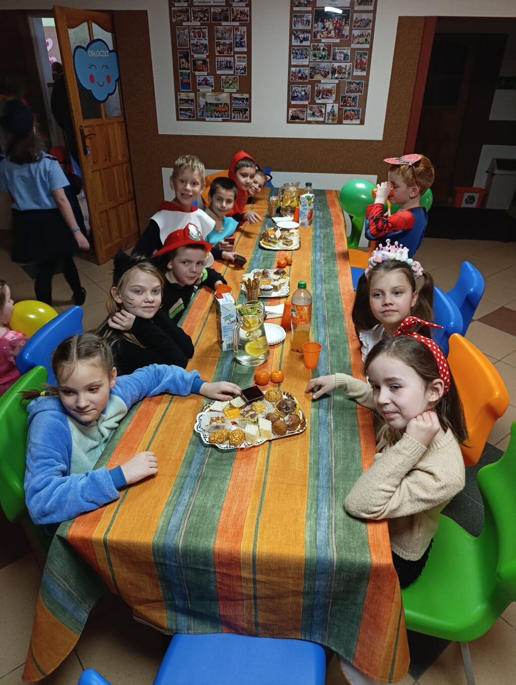 W trakcie zabawy na uczestników czekał również słodki poczęstunek. Na stołach pojawiły się pyszne ciasta, galaretki oraz owoce, które pozwoliły nabrać sił do dalszej zabawy.