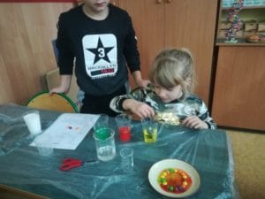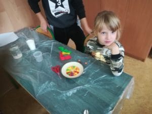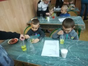 Do wykonania kolorowych doświadczeń dzieci potrzebowały kilku domowych składników i rekwizytów a efekty były zadziwiające. Na początek Sówki przypomniały sobie jakie mamy barwy podstawowe i sprawdzały poprzez mieszanie kolorów podstawowych jakie można uzyskać barwy pochodne. Następnie ze smacznych cukierków Skittless dzieci uzyskały Kolorową tęczę na talerzu.
