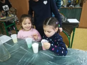 Grupa Sówek została zaproszona na zajęcia pt. ?Bawimy się kolorami? prowadzone przez panią Asię i klasę VI. Wszyscy postanowili wcielić się w rolę małych badaczy. Wiele doświadczeń wykonanych tego dnia stanowiło świetną zabawę dla przedszkolaków.