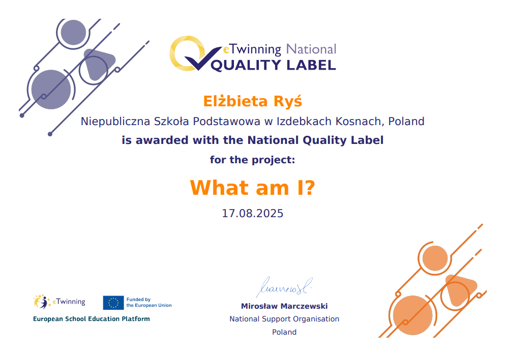 Z ogromną dumą informujemy, że projekt „What am I?”, realizowany w ubiegłym roku szkolnym przez uczniów obecnej klasy 5, został uhonorowany Krajową Odznaką Jakości eTwinning. Jest to pierwsza odznaka zdobyta przez naszą szkołę, dlatego cieszy nas ona szczególnie mocno. Wiemy, że uzyskanie takiego wyróżnienia nie jest łatwe, tym bardziej więc doceniamy ten sukces i mamy nadzieję, że będzie on początkiem kolejnych osiągnięć.