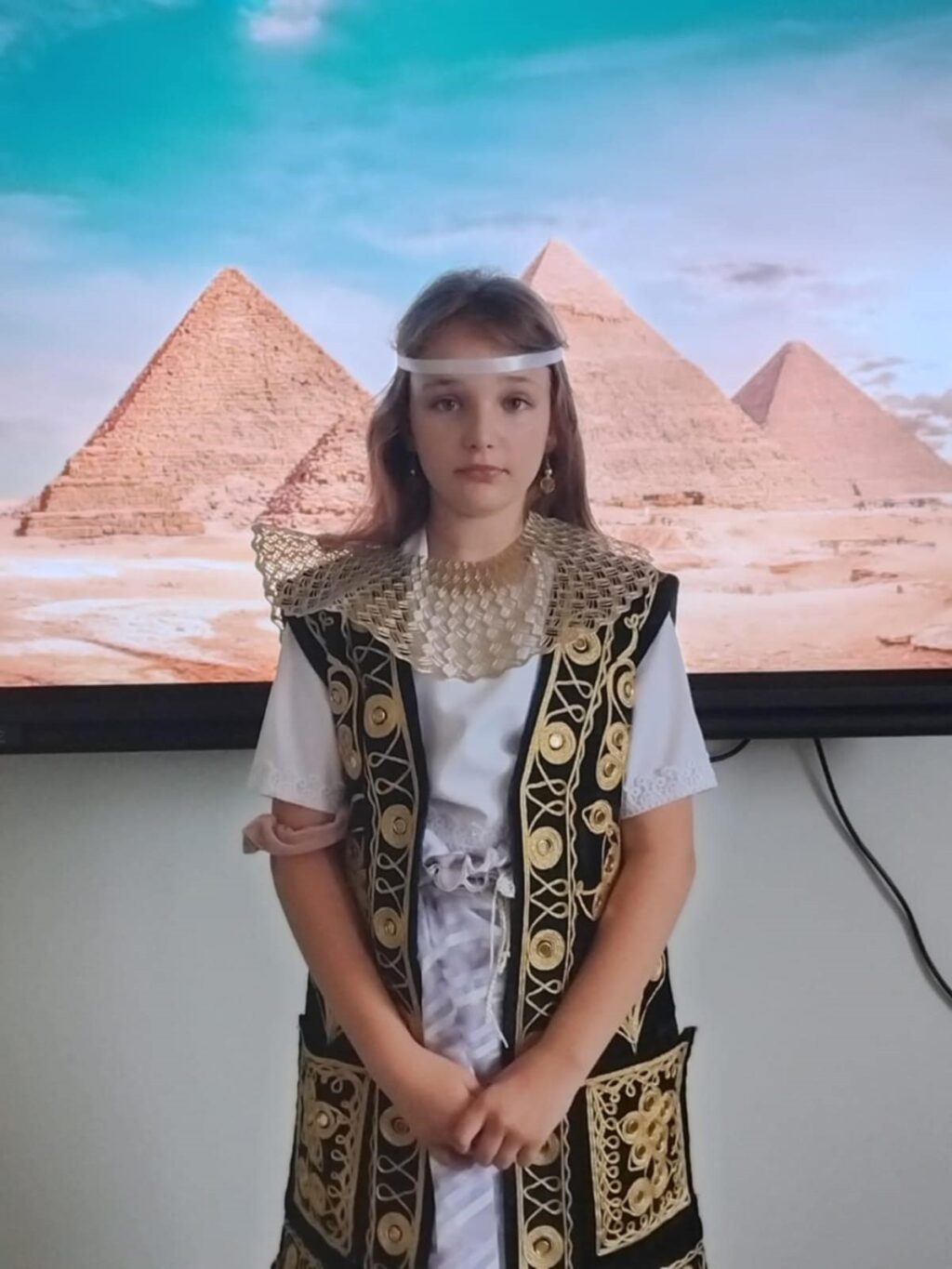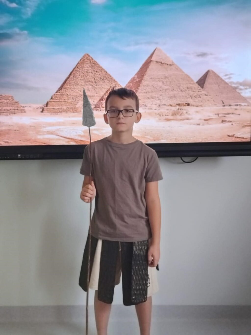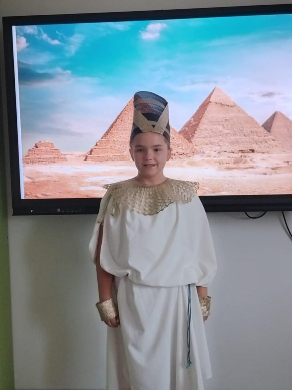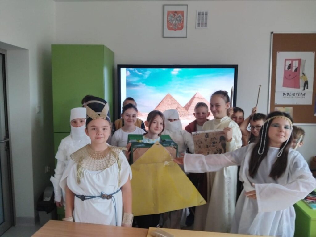 Podczas ostatniej lekcji historii uczniowie klasy V odbyli niezwykłą podróż w czasie. Sala lekcyjna zamieniła się w starożytny Egipt, a dzięki kostiumom i odegranym rolom dzieci przeniosły się do świata faraonów i piramid. Uczniowie wcielili się w różne postacie egipskiego społeczeństwa.