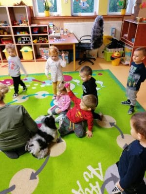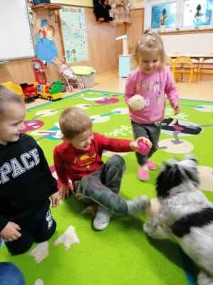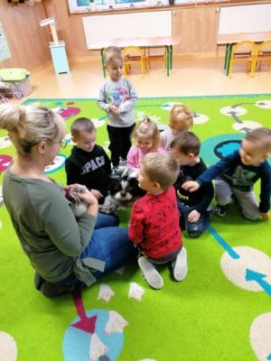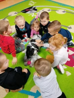 Do dzieci z grupy Krasnali 21 listopada przybył niezwykły gość – suczka Tosia. Z niezwykłą radością powitała siedzące na dywanie dzieci, merdała ogonem na ich widok i chciała się bawić. Pani Izabela Filipczuk (właścicielka pieska) opowiedziała dzieciom o Tosi, jak należy o nią dbać oraz karmić. W czasie zajęć przedszkolaki mogły osobiście doświadczyć łagodności psa, który cierpliwie wysłuchiwał wydawane mu polecenia, a przede wszystkim bardzo posłusznie je wykonywał. Wizyta Tosi wywołała wiele emocji, a kontakt z czworonogiem był dużym wydarzeniem w naszej grupie.
