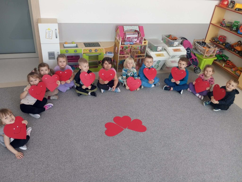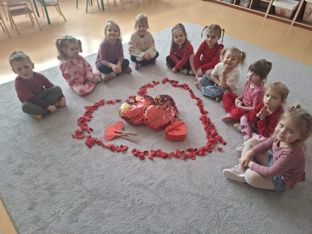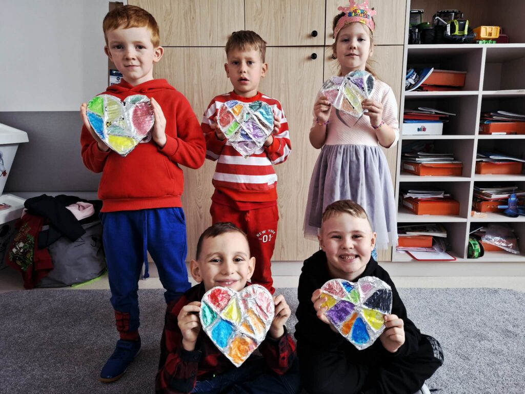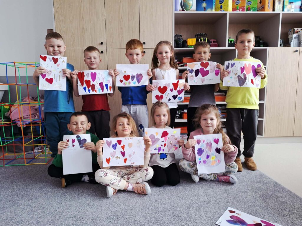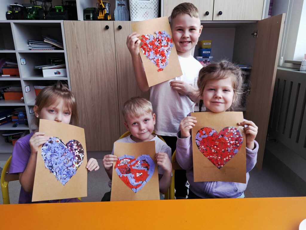 Przedszkolaki z zaangażowaniem tworzyły piękne prace plastyczne – serduszka, kartki walentynkowe i kolorowe dekoracje.